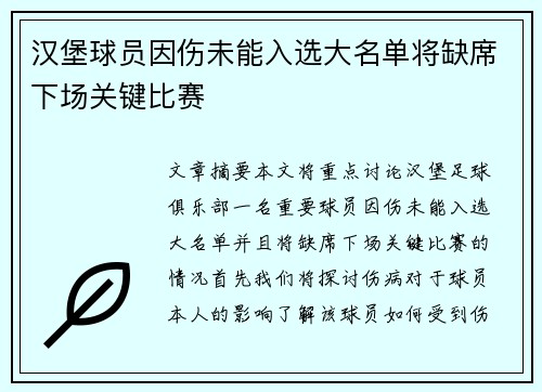 文章摘要:本文将重点讨论汉堡足球俱乐部一名重要球员因伤未能入选大名单,并且将缺席下场关键比赛的情况。首先,我们将探讨伤病对于球员本人的影响,了解该球员如何受到伤病困扰并错过重要比赛。其次,文章会详细分析这一缺席对汉堡队的整体战术安排和球队表现的影响,特别是在关键比赛中的作用。接着,文章将探讨球队在没有该球员的情况下可能面临的挑战,以及教练团队如何调整战术应对这一变化。最后,本文将回顾这场比赛的预期结果,评估汉堡队在没有该球员的情况下能否成功克服困境,取得理想的成绩。通过这些方面的探讨,本文力求全面揭示伤病对球员及球队的深远影响。